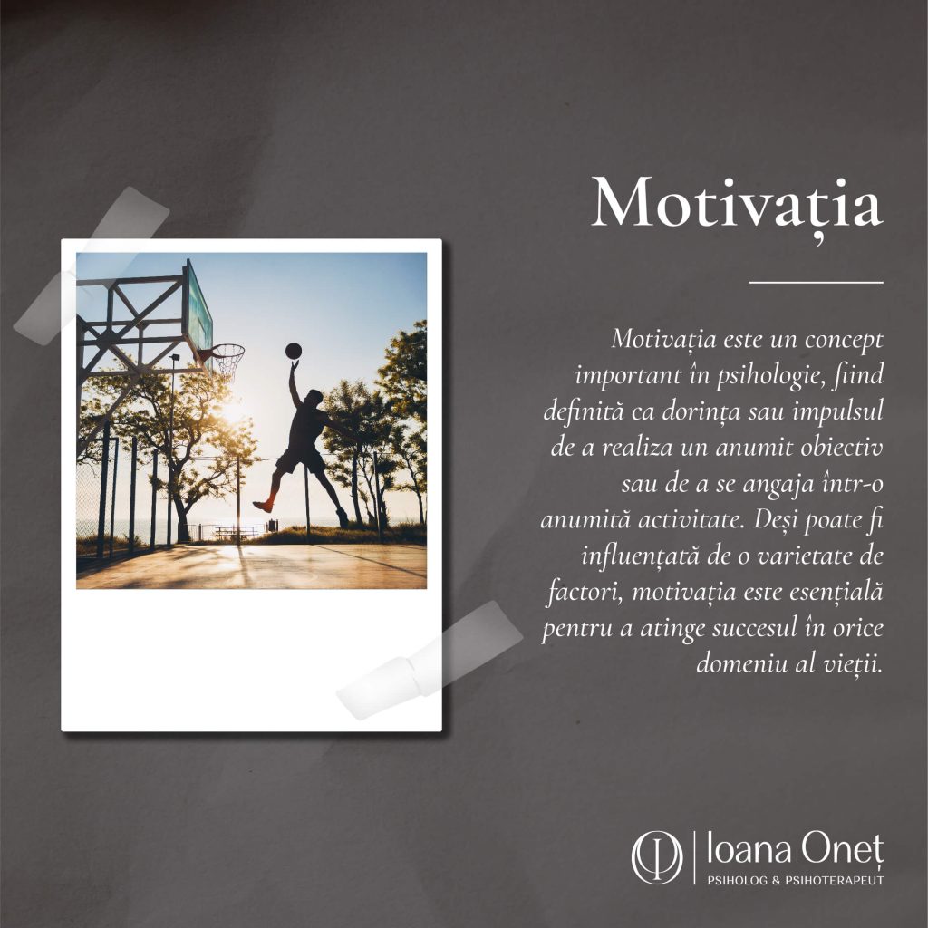 Motivația este un concept important în psihologie, fiind definită ca dorința sau impulsul de a realiza un anumit obiectiv sau de a se angaja într-o anumită activitate. Deși poate fi influențată de o varietate de factori, motivația este esențială pentru a atinge succesul în orice domeniu al vieții.