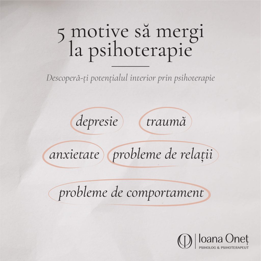 Acestea sunt doar câteva dintre motivele pentru care oamenii apelează la psihoterapie. Este important să reținem că oricine poate beneficia de terapie, indiferent de motivele pentru care alege să meargă.